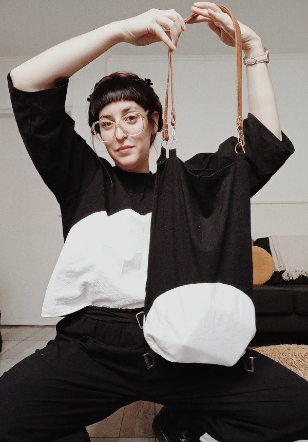 Tote bag de tela tusor negro con recorte en crudo, tiene triple capa de tela (forro vintage, fliselina y el exterior de tusor) para darle cuerpo y resistencia, herrajes de metal y tiras de cuero crudo, trabajado por mí a mano.