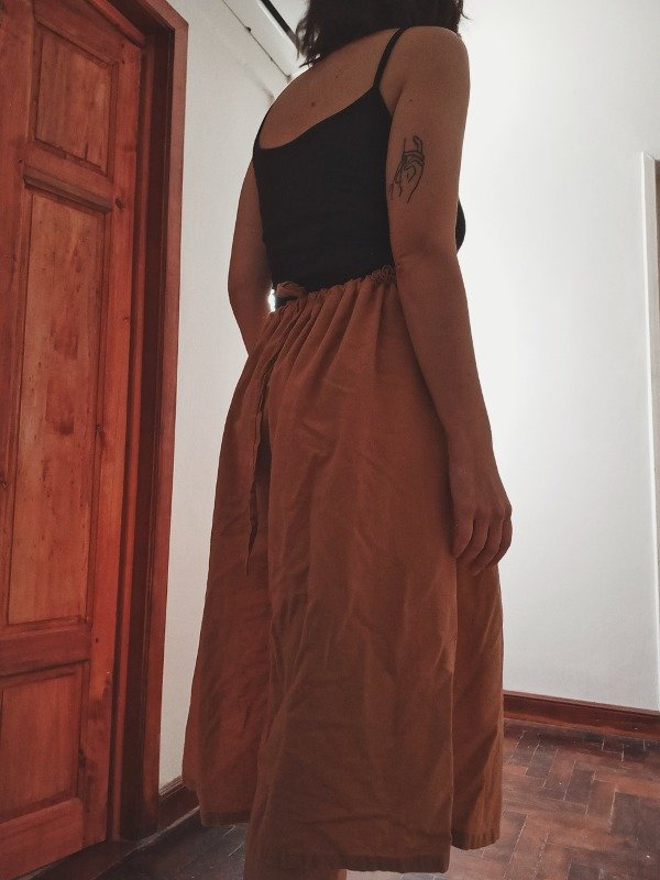 No tiene elástico, es una prenda que abarca varios talles a la vez para poder quedar bien acampanada al ajustarla, si solés usar S o M (hasta 76cm de contorno de cintura), tu talle es S; entre un L y XL (hasta 90cm de contorno de cintura), talle M; entre 2 y 3XL (más de 90 de contorno de cintura), talle L. Colores disponibles negro, canela o rosa viejo (última foto para referencia).