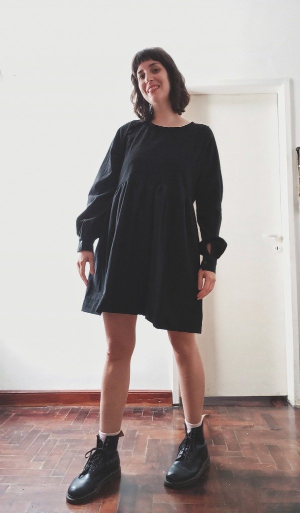 Smock dress confeccionado a mano en tusor. Manga larga con botón en el puño y bolsillos escondidos. Colores disponibles negro, canela o rosa viejo (última foto para referencia).
